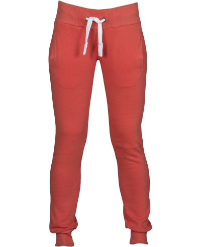 Women’s sweatpants with stretch rib at the waist and bottom of the legs, white drawstring with contrasting stitching and metal rings, two front pockets with rib and reinforced seams