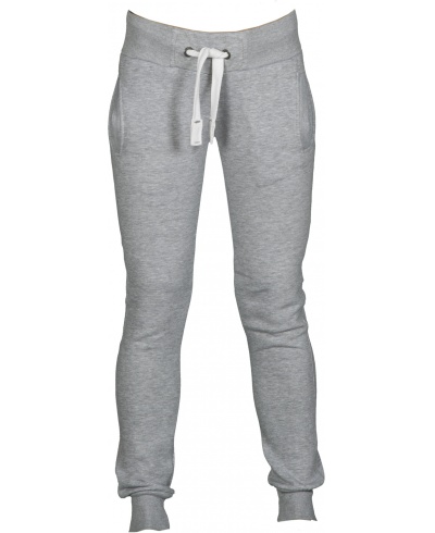 Women’s sweatpants with stretch rib at the waist and bottom of the legs, white drawstring with contrasting stitching and metal rings, two front pockets with rib and reinforced seams