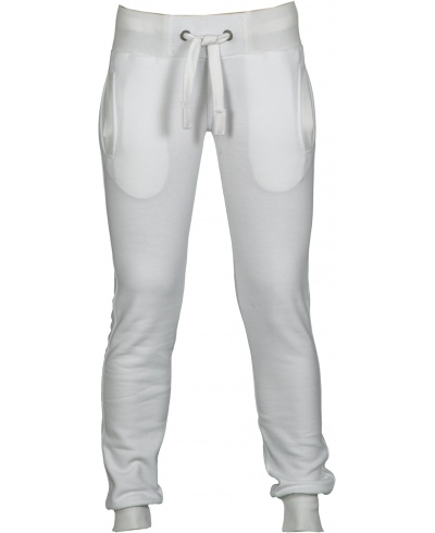 Women’s sweatpants with stretch rib at the waist and bottom of the legs, white drawstring with contrasting stitching and metal rings, two front pockets with rib and reinforced seams