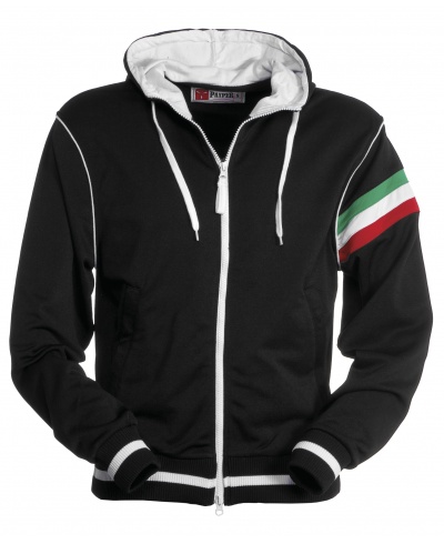 Women’s fitted hoodie with full, contrasting plastic zip with double metal pull. Contrasting hood and drawstring, contrasting stretch rib cuffs and hem, contrasting cuff piping, trim (colours of the flag) on the left sleeve, 2 pockets with zip, reinforced seams and pique type fabric for greater breathability