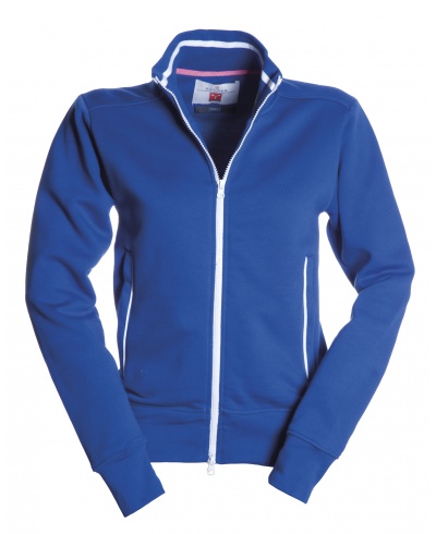 Women’s fitted sweatshirt with full, contrasting coloured plastic SBS zip with double metal pull; rib collar with contrasting trim, side pockets with