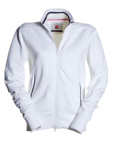 Women’s fitted sweatshirt with full, contrasting coloured plastic SBS zip with double metal pull; rib collar with contrasting trim, side pockets with