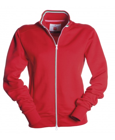 Women’s fitted sweatshirt with full, contrasting three-coloured plastic SBS zip with double metal pull, rib collar with contrasting trim, fitted sleeves, two outer pockets, stretch rib cuffs and hem, reinforced seams