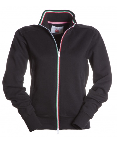 Women’s fitted sweatshirt with full, contrasting three-coloured plastic SBS zip with double metal pull, rib collar with contrasting trim, fitted sleeves, two outer pockets, stretch rib cuffs and hem, reinforced seams
