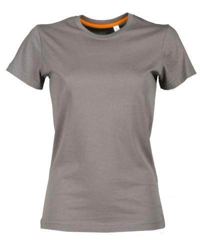 Women’s short-sleeved fitted crew neck t-shirt, with 1.5 cm spandex mix rib neckband with top stitching on the front, contrasting shoulder-to-shoulder reinforcement tape visible on the inside collar, stretch seams, side seams. No label