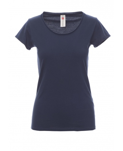 Women’s fitted short-sleeved T-shirt with scooped raw finish neck, shoulders with double stitched seams inside, sleeves with narrow raw finish turn-up, side seams, transfer label
