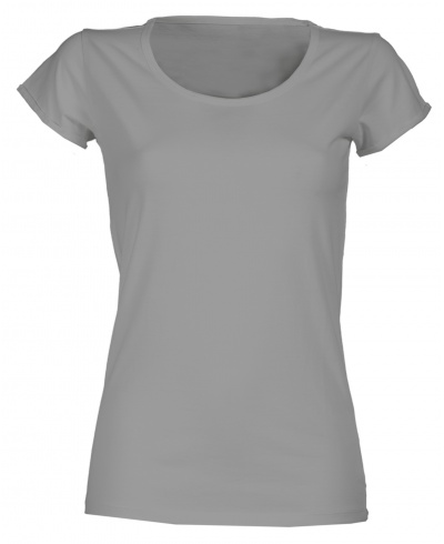 Women’s short-sleeved fitted t-shirt with slightly scooped neck, with narrow edge neckband, sleeves with narrow raw finish turn-up, side seams. No label