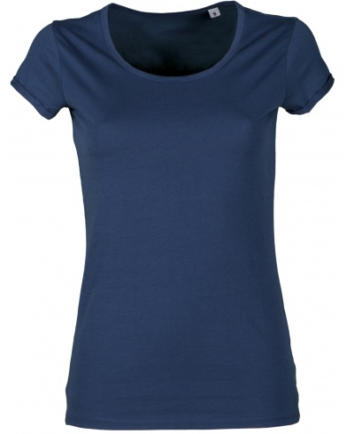 Women’s short-sleeved fitted t-shirt with slightly scooped neck, with narrow edge neckband, sleeves with narrow raw finish turn-up, side seams. No label