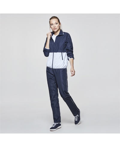 Tracksuit for woman combined with jacket and pants. Zippers to contrast. Bottom leg with adjustable elastic band. Full inner mesh lining. Pants with ribbed to contrast in side seam. Elastic waistband and adjustable drawcord to contrast.