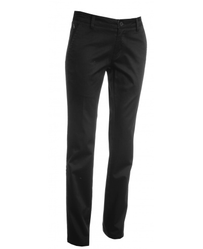 Women’s classic all season trousers, belt loops at waist, French pockets, one small pocket with zip, two inset pockets on back with button, zip fastening with button and patch in real leather, in combed high density two ply cotton enzyme wash