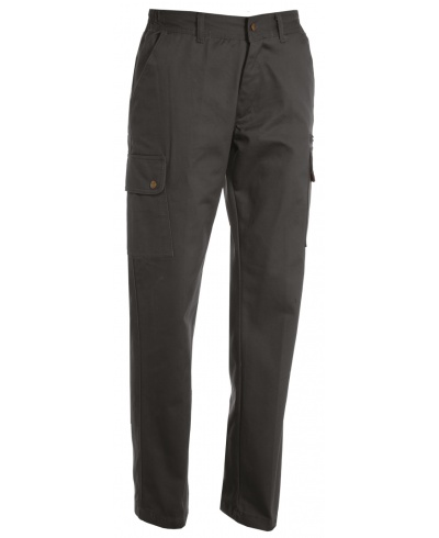 Women’s classic all-season stretch trousers with side elastic and waist belt loops, zip fastening with metal button, two classic front pockets, two large side pockets with flaps and snap fasteners, one left pocket with zip, one foldaway tape measure pocket on the right, two slit back pockets with button and buttonhole