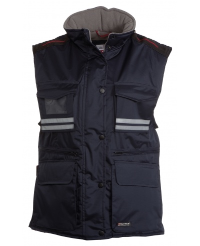 Women’s comfort-fit vest, 8 mm plastic zip with metal pull, with flap fastening and plastic buttons, detachable and/or foldaway shaped hood, grey reflective stripes on the front and back, side vent with gusset and zip, nine outer pockets, two with LOCK SYSTEM, two with zip and reinforced inner, one with a reversible badge holder. Padded, collar, back and lower back warmer in micro-fleece, inner drawstring and zip for easier printing and embroidery