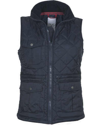 Women’s comfort-fit quilted vest, 8 mm plastic zip with metal pull, side vents with button, five outer pockets, two with LOCK SYSTEM. Padded, corduroy rib inside collar, one inner pocket