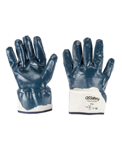 NBR gloves, ventilated back, long cuff, cotton-jersey coated; Features: sturdy, very resistant; Strengths: fit, grip, protection, resistant to liquids, practical; Areas of application: heavy-duty handling, metals, sharp and abrasive materials, oil, grease, dirt, hydrocarbons, lubricants