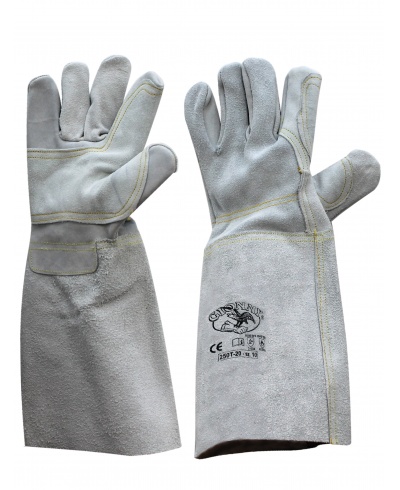Cowhide split leather gloves, reinforced split leather palm, thumb and index finger, wrist protection, 20 cm split leather cuff; Features: sturdy, very resistant; Strengths: grip, protection; Areas of application: heavy-duty handling, suitable for contact with hot, deburred material