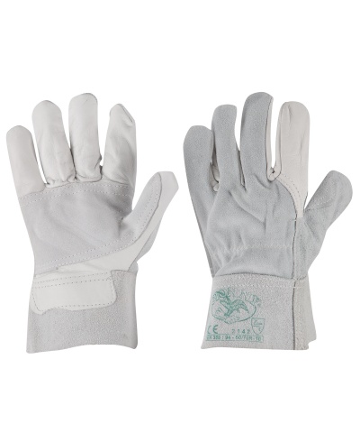 Cowhide grain gloves with split leather back - palm and thumb split leather reinforcement - wing thumb - leather cuff; Features: soft, strong, resistant; Strengths: comfort, easy to use; Areas of application: general handling in dry conditions