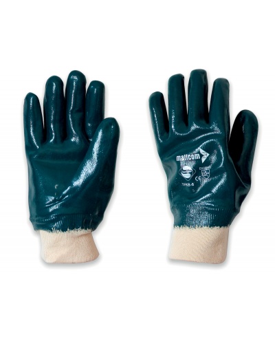 NBR gloves, fully lined, knit cuff, 24 G interlock cotton coated, sanitised - Features: sturdy, very resistant; Strengths: fit, grip, protection, resistant to liquids, practical; Areas of application: heavy-duty handling, metals, sharp and abrasive materials, oil, grease, dirt, hydrocarbons, lubricants