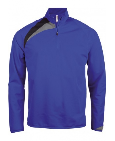 100% polyester brushed polytricot. Zip neck. Contrast panel details. Matching coverstitch. Elasticated hem and cuffs.
